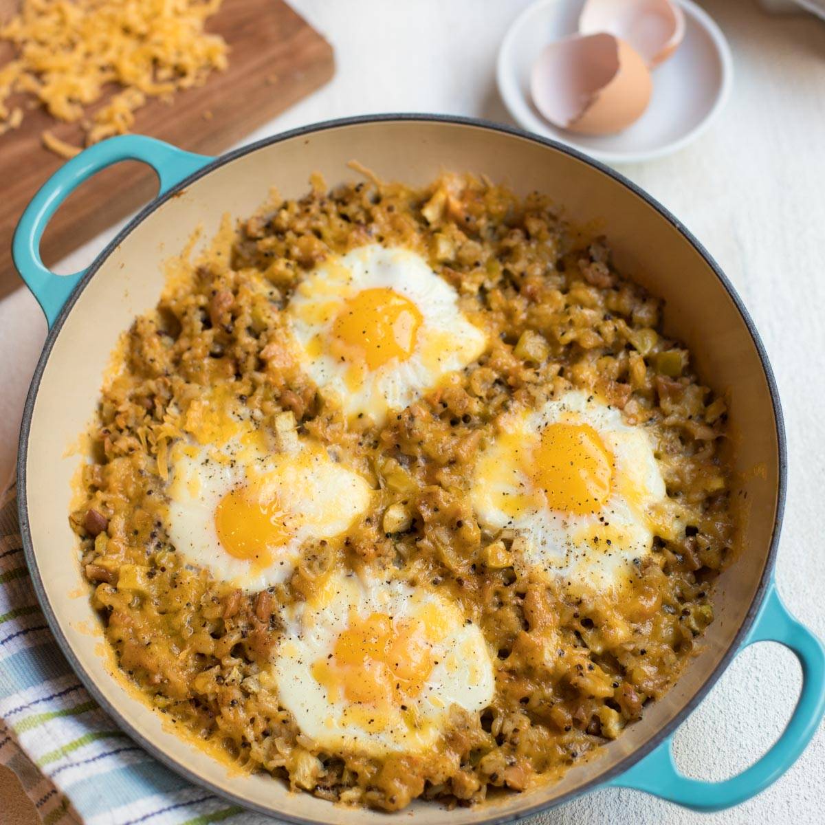 A quick, cozy breakfast of crisped leftover stuffing topped with soft-baked eggs and melted cheese.