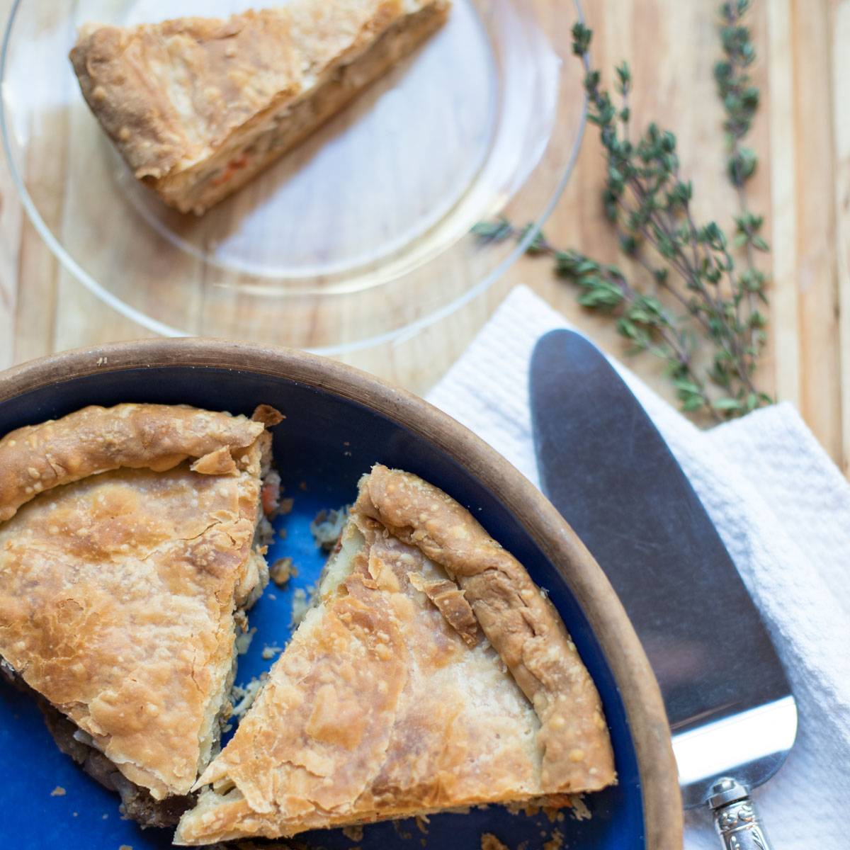 Tourtière – pork, onions, turkey, and mashed potatoes flavored with garlic, thyme, sage, and spices are the flavorful filling in this delicious savory pie.