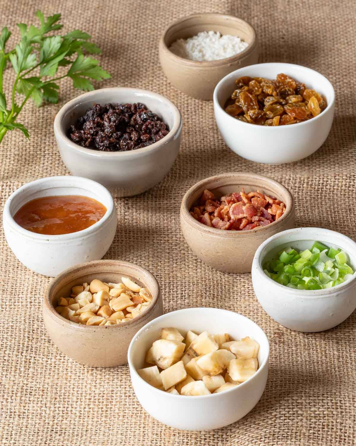 A fun tip: I picked up this idea from Michael Field’s Cooking School cookbook, and it truly transforms the dried fruit condiments. Marinate golden raisins in brandy and currants in port for 3 to 24 hours. The dried fruit plumps beautifully, becomes tender, and gains layers of subtle flavor that pair wonderfully with the warm curry.